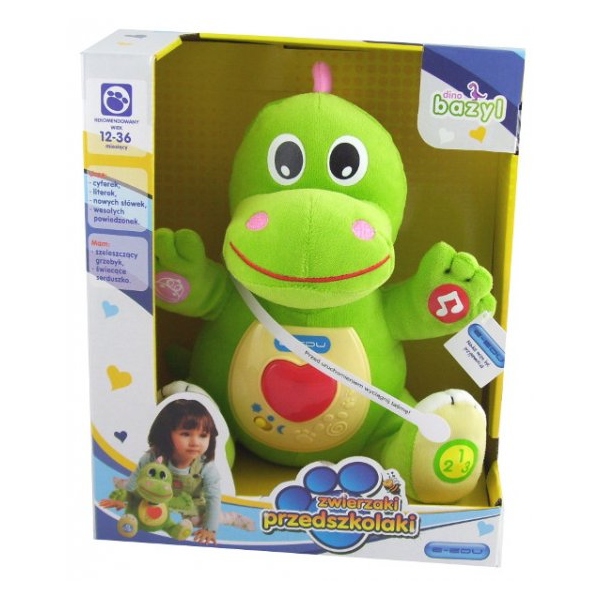 Bazyl przygotował się odpowiednio do tego zadania. Potrafi poprzez ciekawą zabawę nauczyć zaprzyjaźnione z nim dzieci liczenia (od 1 do 10), literek polskiego alfabetu oraz wielu nowych słów czy powiedzonek. Dodatkowo dinozaur ma na brzuszku specyficzne, podświetlane serduszko i inspirująco szelszczący grzebień, do wykorzystania według własnego pomysłu.