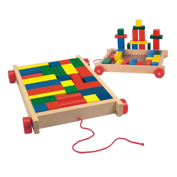Drewniane klocki pokryte bezpieczną dla zdrowia dzieci farbą umieszczone na zgrabnym wózeczku ze sznureczkiem. 34 elementy o różnych kształtach pozwolą na poznawanie kształtów, kolorów i rozwój logicznego myślenia, który zawsze towarzyszy zabawie w układanie i konstruowanie z klocków.