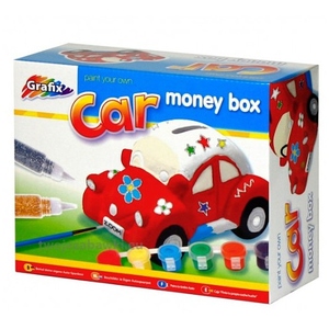 W zestawie znajdują się farbki, pisaki brokatowe i pędzelek do samodzielnego ozdobienia skarbonki w kształcie samochodu. Tylko od Ciebie zależy jak będzie wyglądała Twoja skarbonka. Oszczędzanie stanie się łatwiejsze i znacznie przyjemniejsze.